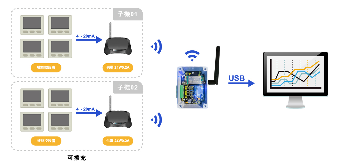 此套系統可以迅速檢視機房設備狀態。使用合法無線電頻段,以子機擷取訊號,並透過 LoRa 協定,將設備狀態即時回傳到主機,再藉由 USB 傳輸至監控電腦。縮短檢查的時間、還可隨時查閱設備歷程,管理廠房設備將更為便利。