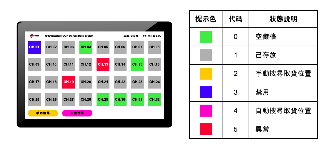 - RFID 感應整合:配置 RFID 感應模組,可即時識別與紀錄晶圓傳送盒資訊。